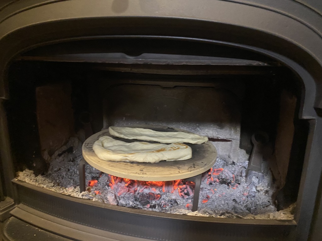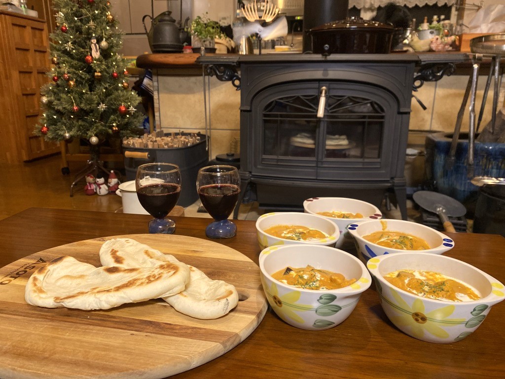 とある休日、薪ストーブでインドカレー(バターチキンカレー)とナンを作りました。