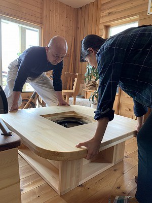 火鉢を囲む囲炉裏風テーブルの完成です!