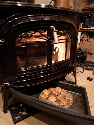 薪ストーブの炉内ではなく、灰の落ちてこない灰受け皿の中で♪